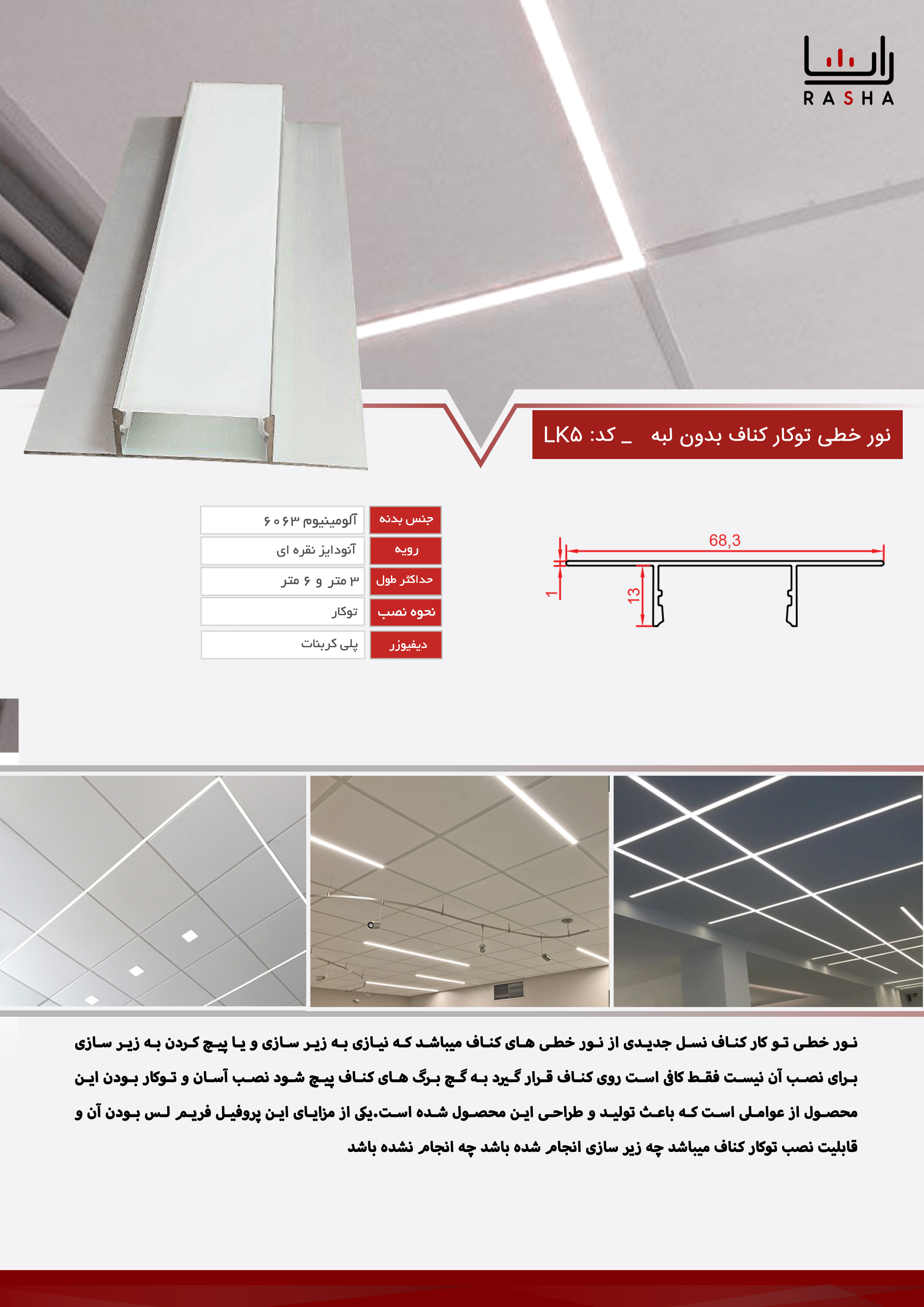 نور خطی توکار کناف با ویژگی های برجسته ای مانند نصب آسان بدون نیاز به زیرسازی و طراحی فریم لس و توکار، انتخابی عالی برای نورپردازی فضاهای داخلی است. این محصول با ارائه نوری یکنواخت و زیبا، به ارتقاء کیفیت فضاهای داخلی کمک می کند و گزینه ای ایده آل برای انواع پروژه های ساختمانی، از جمله پروژه های بازسازی و نوسازی، محسوب می شود. با انتخاب نور خطی توکار کناف، می توانید از نورپردازی مدرن و کارآمد بهره مند شوید و جلوه ای خاص به فضای خود ببخشید